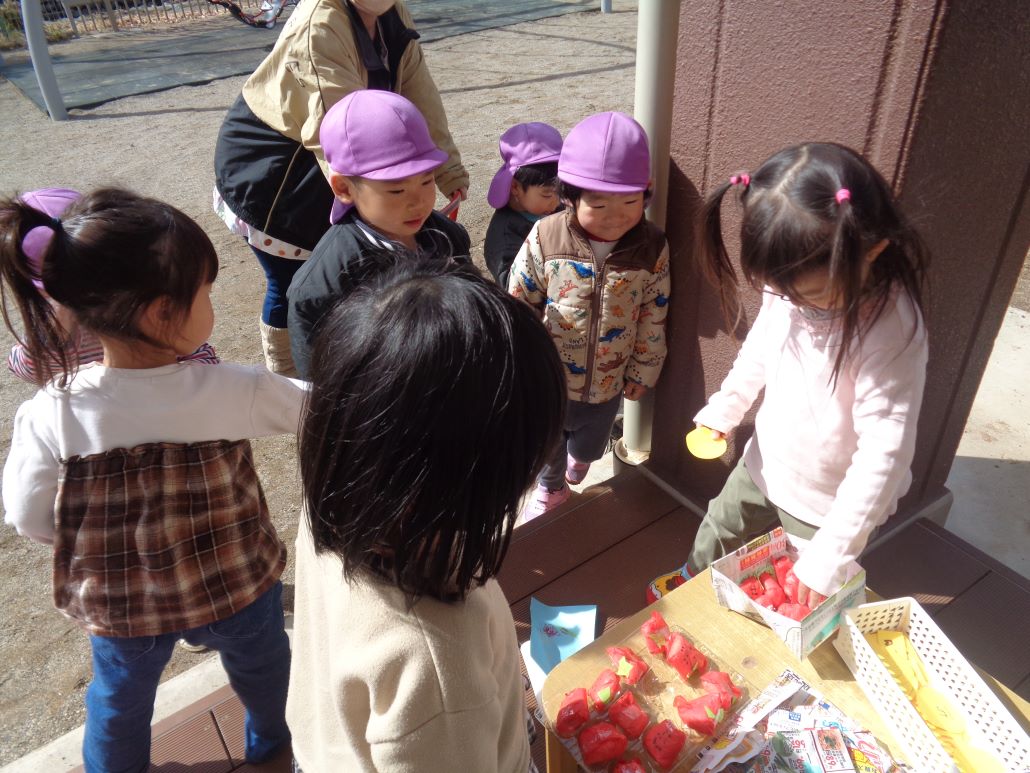 今日は廊下の人通りが少なく、なかなか売れません・・・。Sちゃんから「移動してみれば?」と提案があり、外で売り出すとてんし組の子ども達にたくさん売れました。ですが、風が強くお金やイチゴが飛んで行ってしまい、廊下に戻って行きました。自分たちで売れそうな場所を考えて選び、その先でまた課題が見つかり・・・。お店も試行錯誤の日々です。