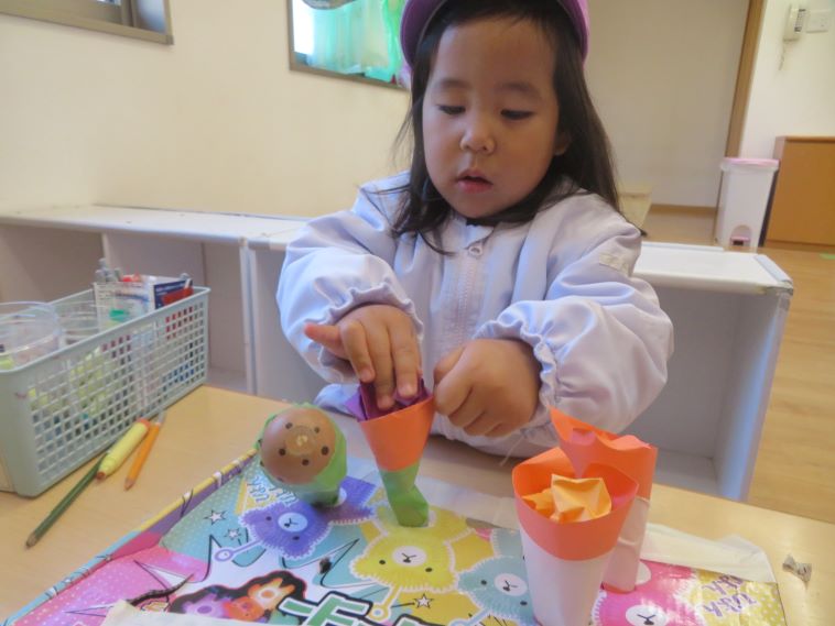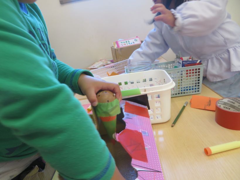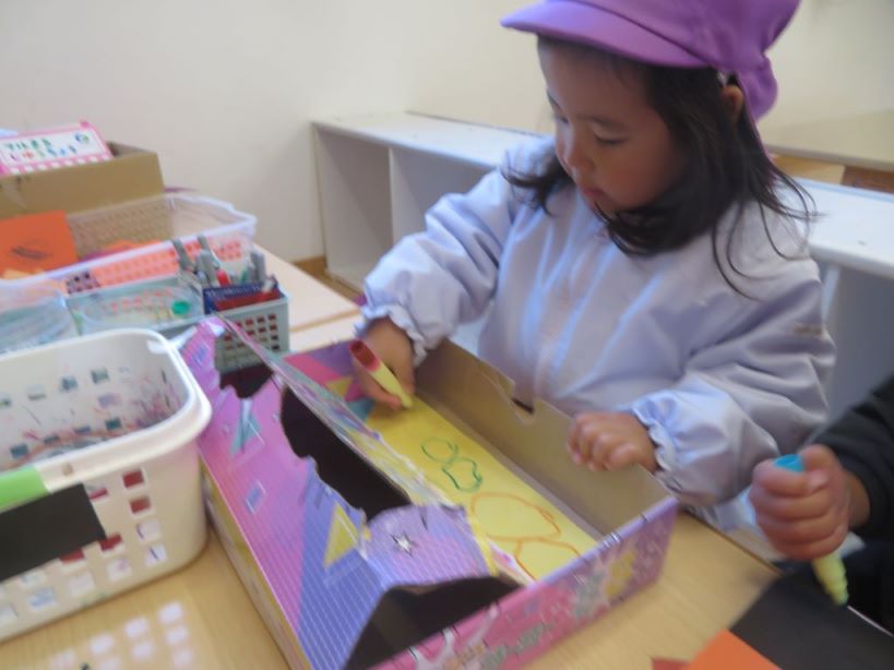 廃材コーナーに行きお楽しみ会で使った景品の入れ物を発見したはなちゃん。その箱を使ってアイス屋さんをしたいと考えました。早速、お部屋で友達とどうやってアイスを作るか考え始めました。