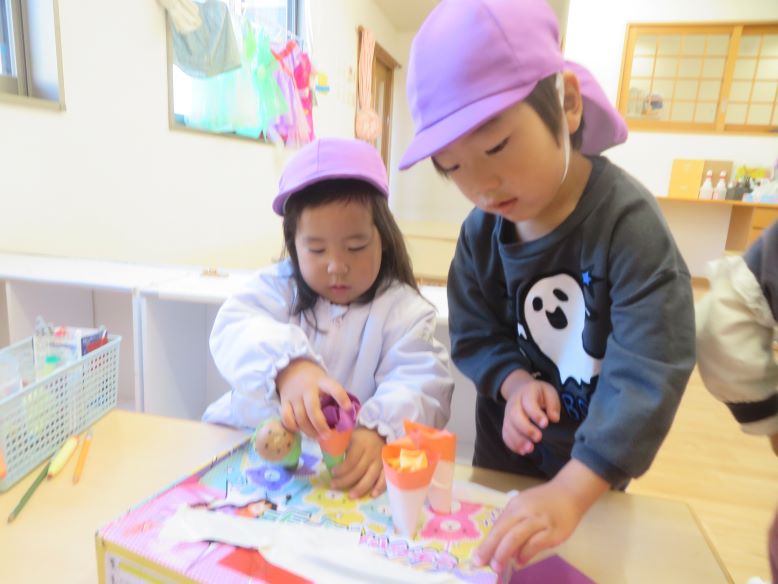 お楽しみ会で大人が販売している姿を遊びに取り入れ、社会性やコミュニケーション能力を身につけた子ども達でした。普段、異年齢児とあまり関わらない子も遊びを通して言葉のやり取りをすることができ、自信へとつながりました。