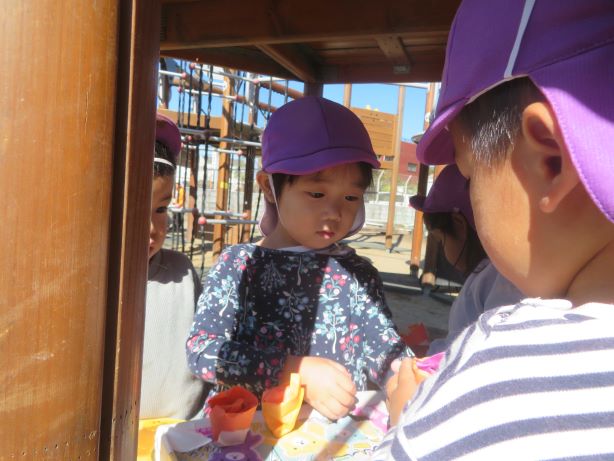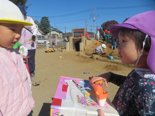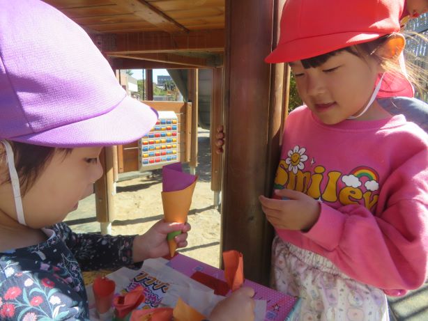外に出てアイスの販売です! 「いらっしゃいませ~」「これがいい?」とアイス屋さんになりきっています。