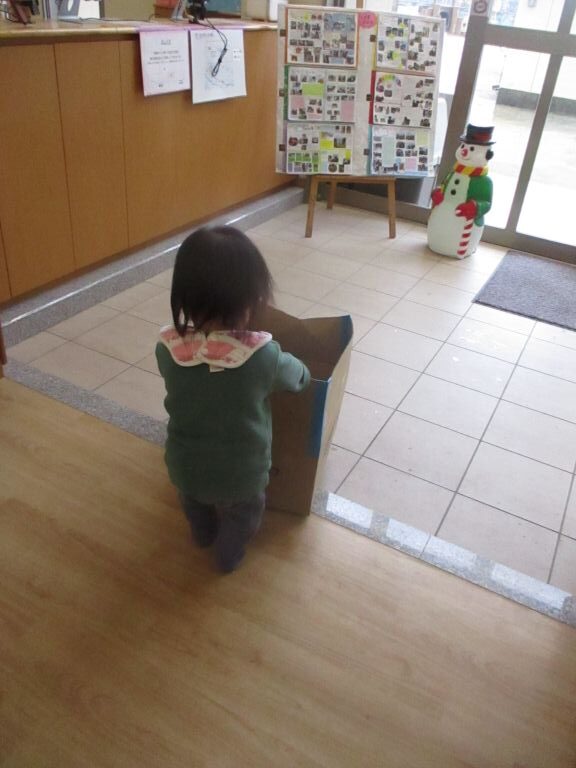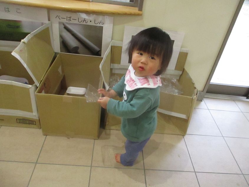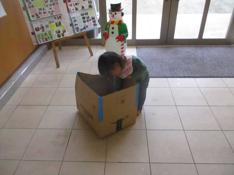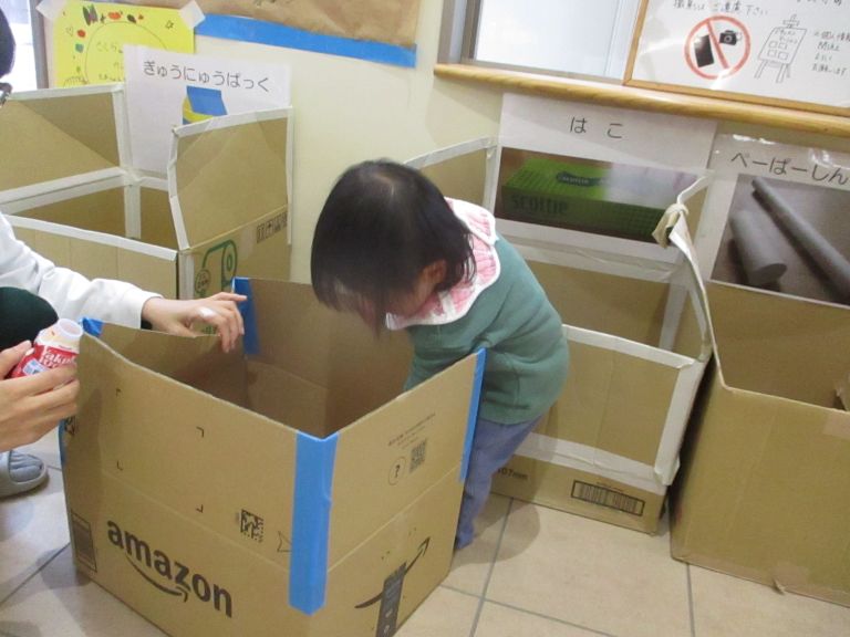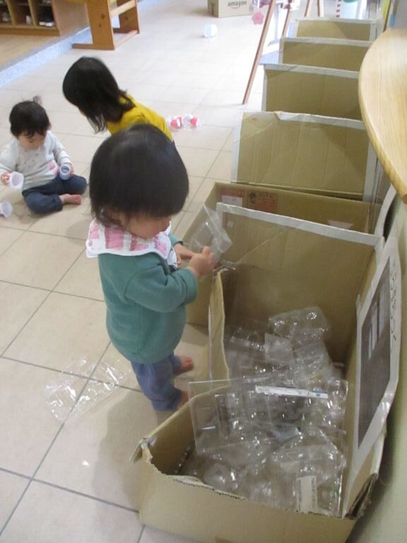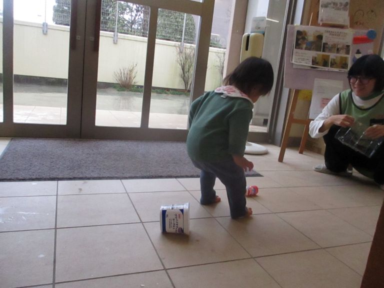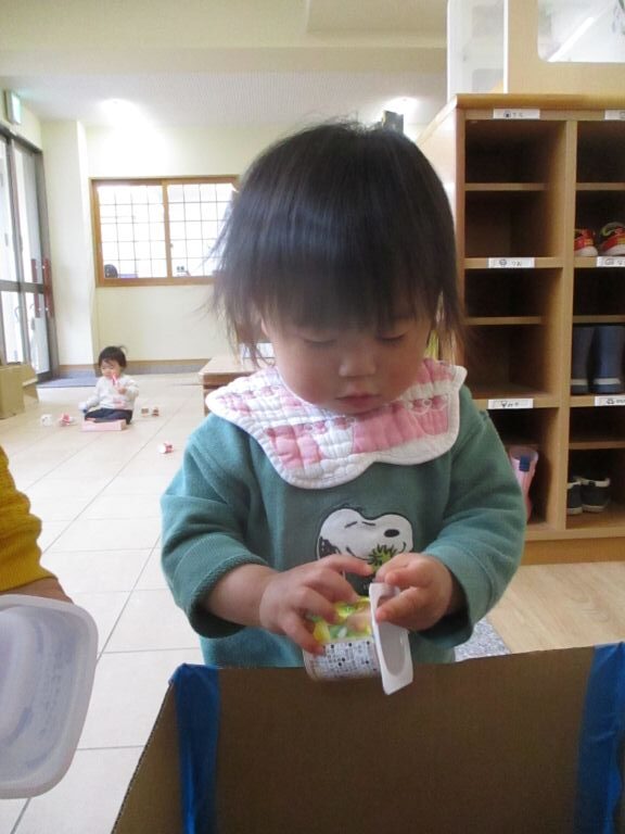 室内遊び中にK君が見つけたのは玄関に並ぶ廃材入れの箱!!体がすっぽり入ってしまいそうな箱をのぞき込んで気になるものに手を伸ばしますがなかなか届きません。あきらめないK君と動いてしまう箱…。そうこうしているうちに一つ容器が取れました!が…「これは違う」と思ったのか容器をポイっとしてしまったK君。すると…コンコンカラン♪と落ちて弾んだ容器からおもしろい音が♪
